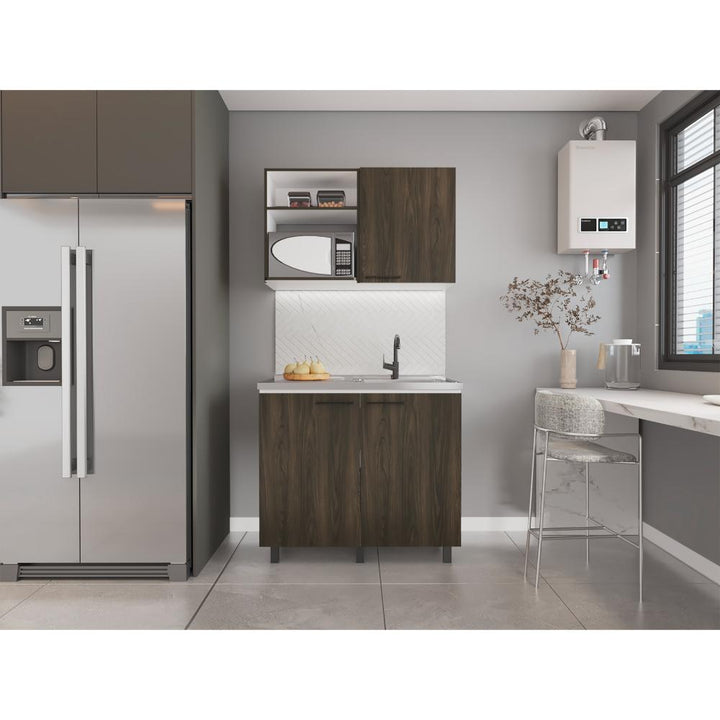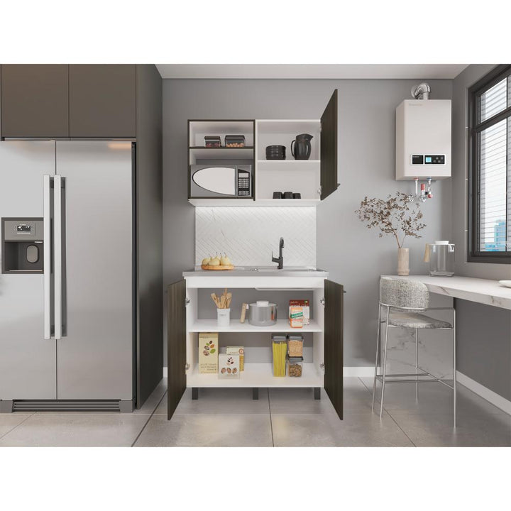 Cocina Integral, con Mesón Izquierdo, 3 puertas batientes, varios entrepaños, manijas y patas metálicas.
