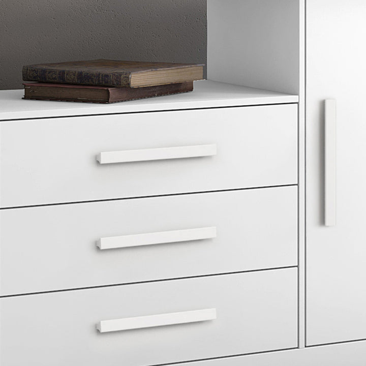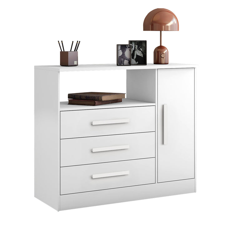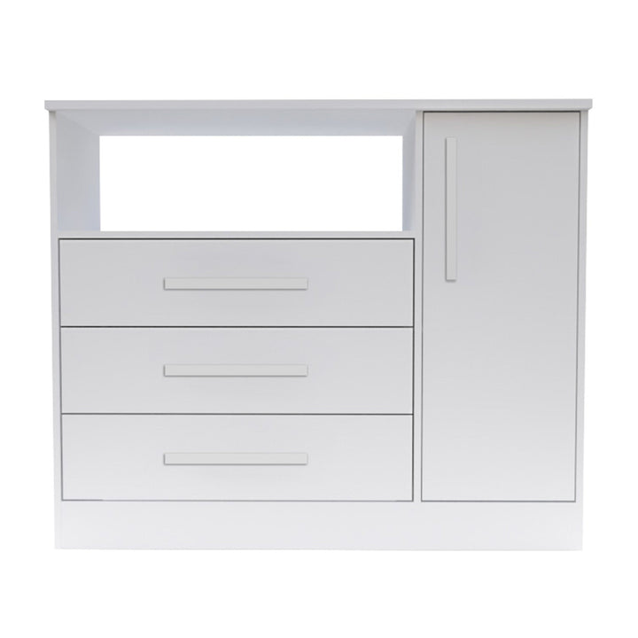 Cómoda, Cuenta con una puerta abatible y 3 cajones ofrece un amplio espacio de almacenamiento para mantener tu ropa y accesorios organizados. Además, su diseño versátil y elegante se adapta a cualquier estilo de decoración, fabricado en madera aglomerada color Blanco.
