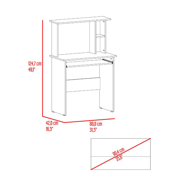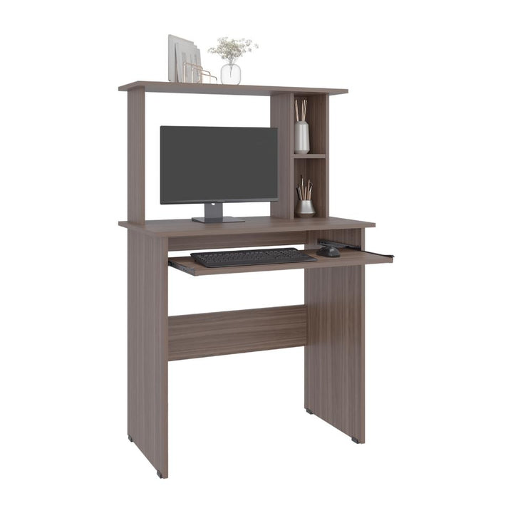 Escritorio, con amplio espacio para computador, entrepaños para colocar libros u objetos, badeja movil para teclado, es de facil instalación