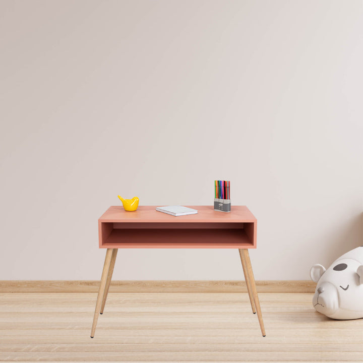 Escritorio con patas en madera clara diagonal y mesa en color Arupo, contiene tarugos y requiere armado.