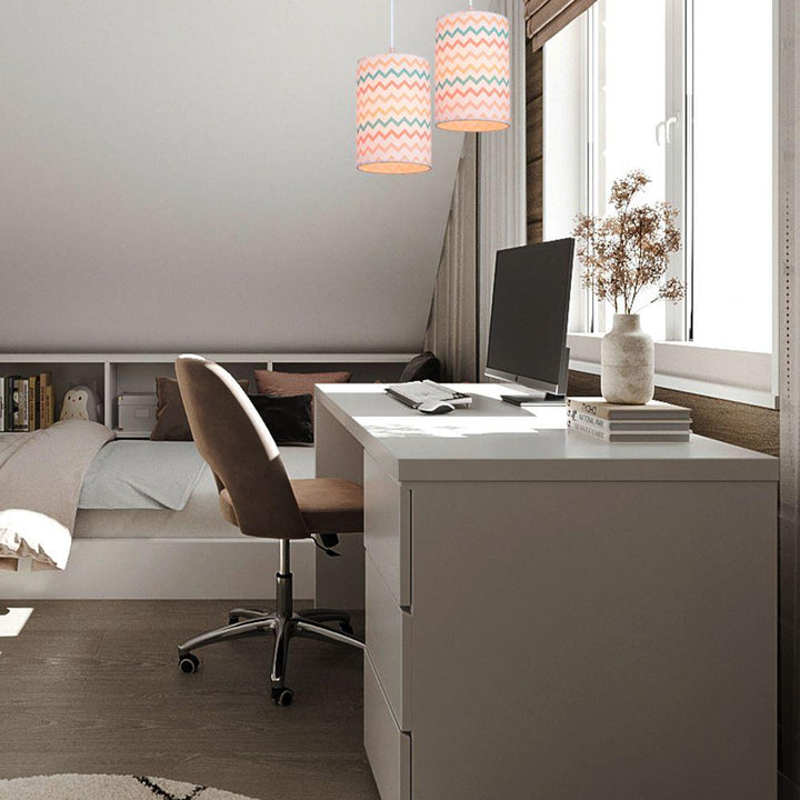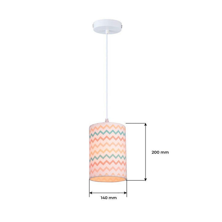Lámpara, elaborado en Metal, Divertido diseño de lámpara infantil colgante, perfecta para iluminar y decorar las habitaciones de los más pequeños de casa. Aplicación colgante en forma cilíndrica con rayas de colores, regulable en altura, tela estampada de alta definición y plastificado por dentro en acetato PVC.