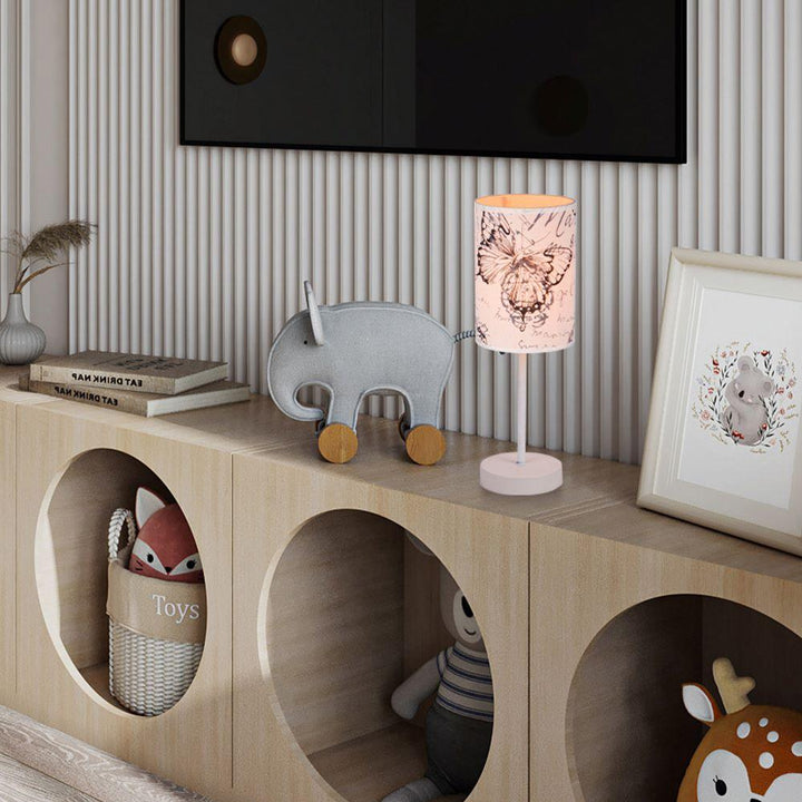 Lámpara de Mesa, elaborado en Metal, Divertido diseño de lámpara de mesa infantil, perfecta para iluminar y decorar las habitaciones de los más pequeños de casa. Aplicación de mesa, en forma cilíndrica,tela estampada con mariposas y plastificado por dentro en acetato PVC.