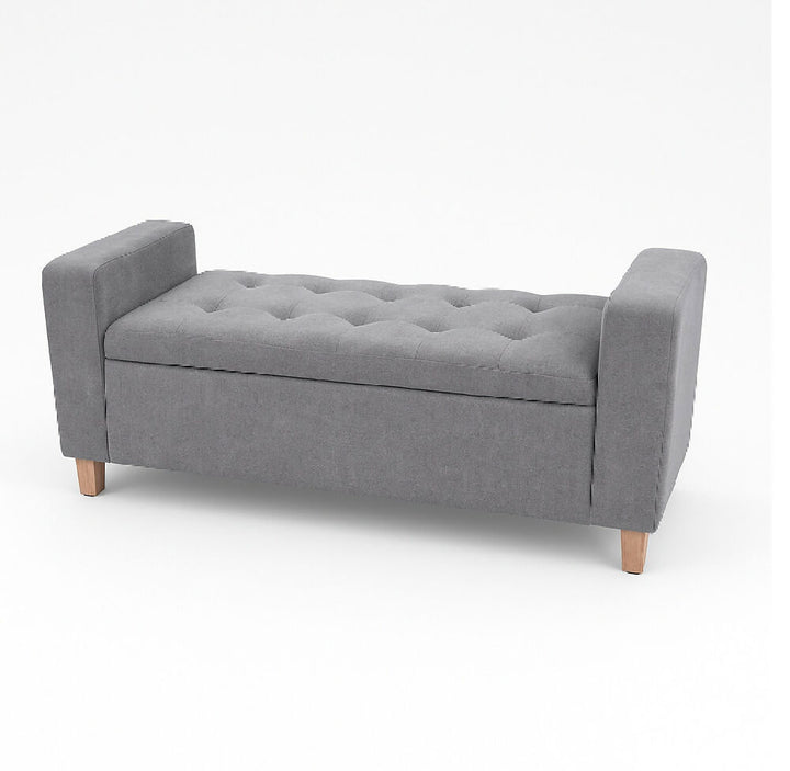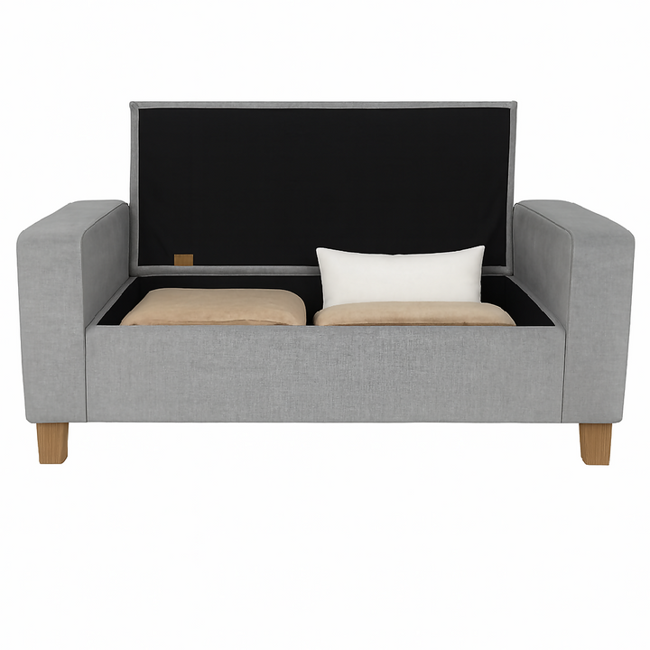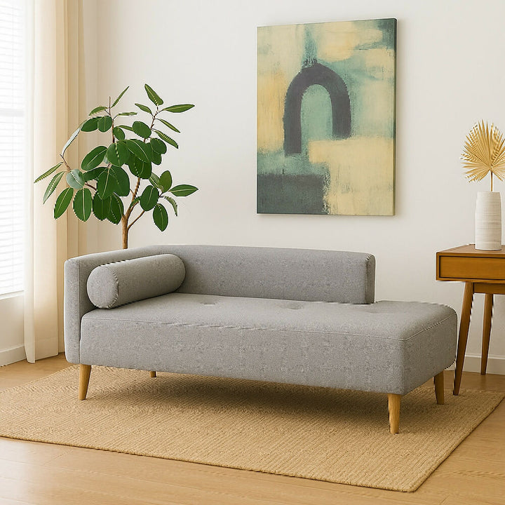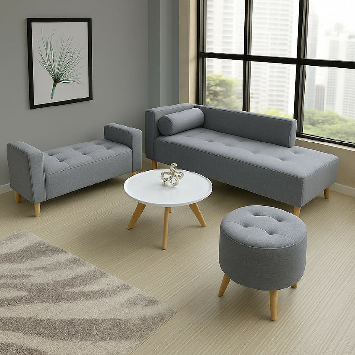Combo de sala en color gris: frescura, estilo y confort para tu hogar. Incluye un sofá tipo chaise long, una banqueta baúl con brazos y un puff. Cuentan con estructura en madera natural, espuma de alta densidad para mayor comodidad y patas en madera color natural, que suman calidez y elegancia al diseño.
