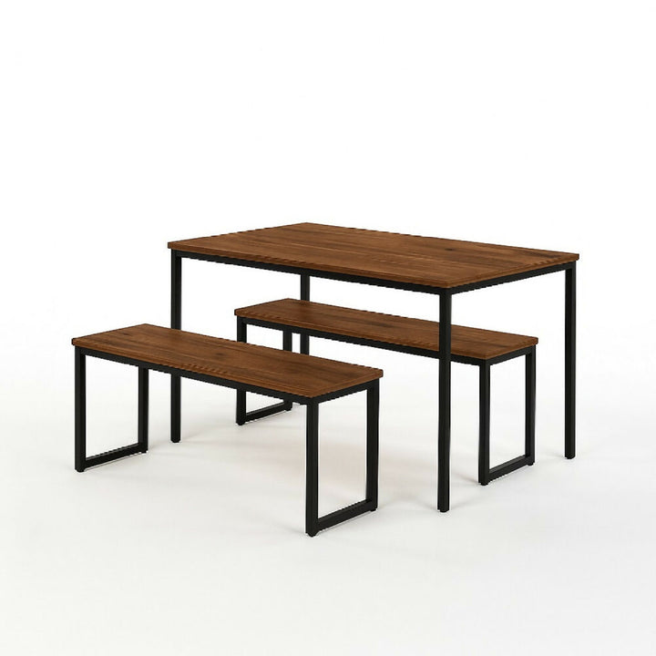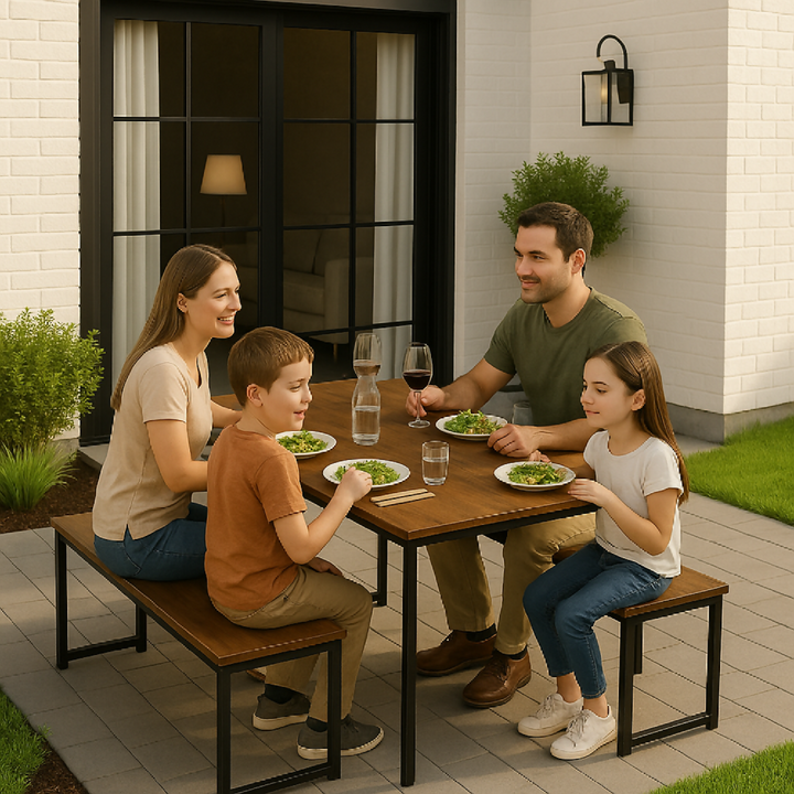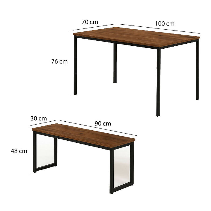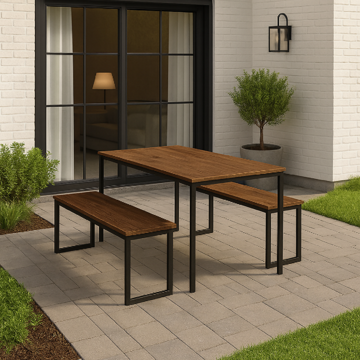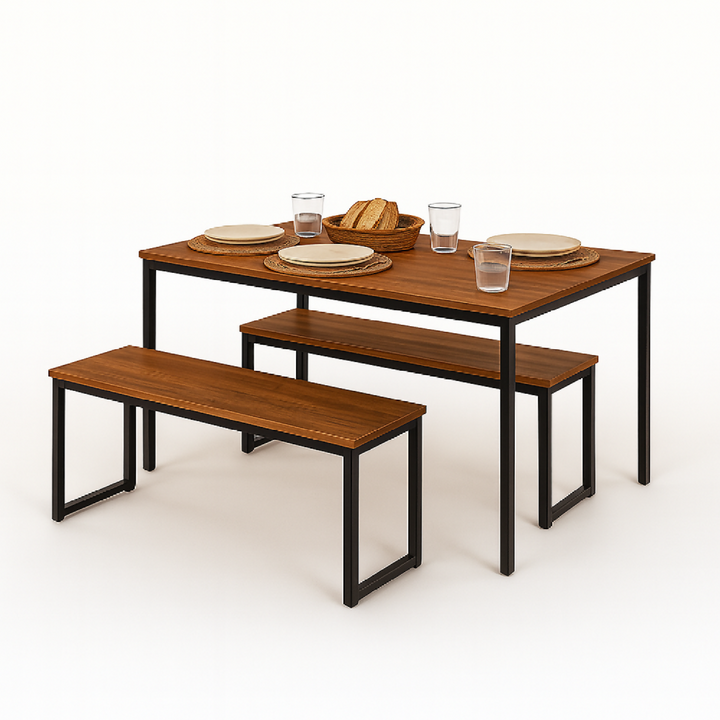 Comedor 3 piezas para 4 personas. Superficie en melamina con protección antimicrobiana al 99.9% y estructura metálica con pintura electrostática negra. Incluye 2 sillas tipo banco que combinan estilo industrial, comodidad y funcionalidad.
