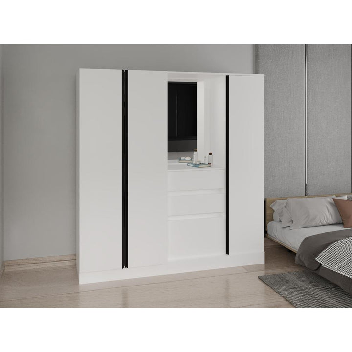 Closet, con tres puertas abatibles, tubos cromados para colgar ropa, tres cajones multiusos, zapatero inferior con puerta abatible