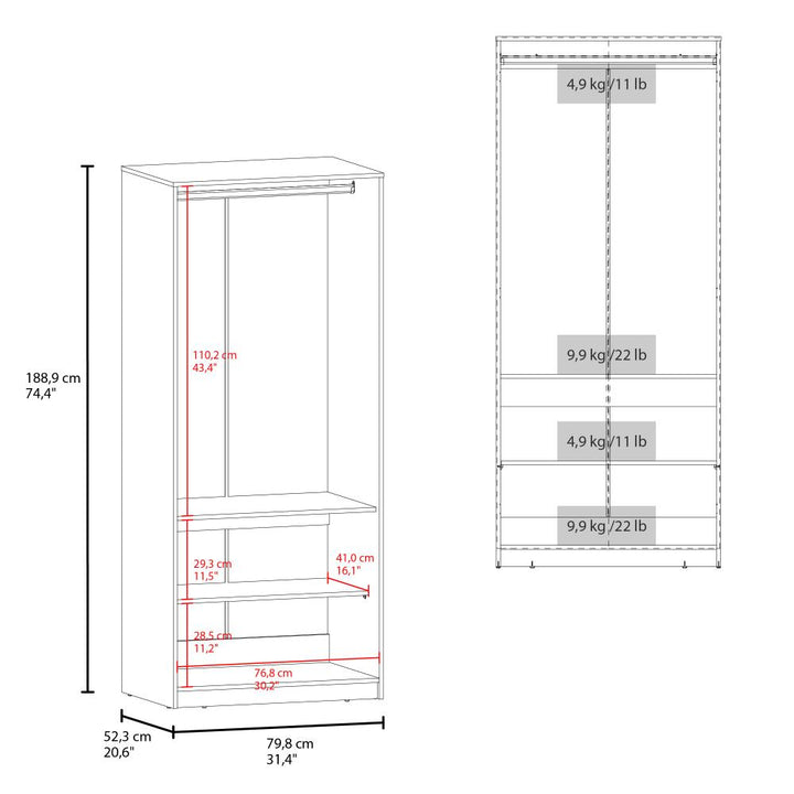 Closet, con espacio para colgar ropa, dos puertas abatibles y dos entrepaños, este producto debe ser anclado a la pared e incluye los elementos para hacerlo.