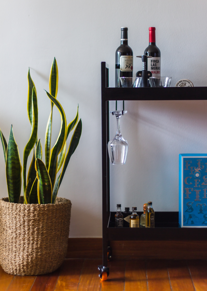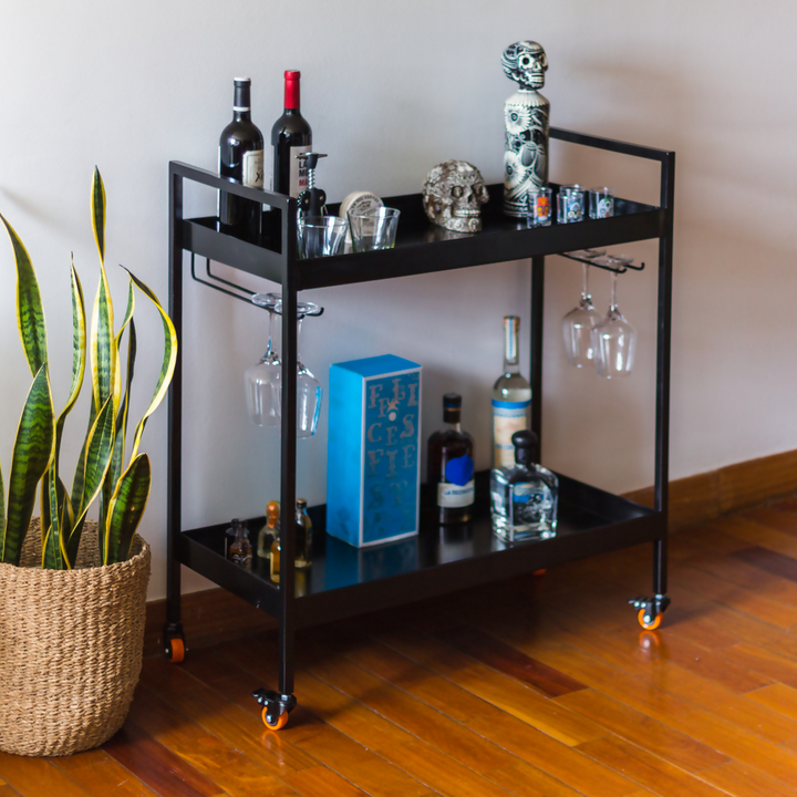 Nuestro carro bar BARK está hecho para transportase fácilmente por todas las zonas de tu casa proporcionando nuevos espacios de reuniones. Esta elaborado 100% en varilla de hierro y lamina de acero calibre 16 con terminado en pintura electroestática lisa negro mate y rodachinas con freno. Cuenta con dos (2) ganchos para colgar tus copas de manera que tengas más espacio disponible.