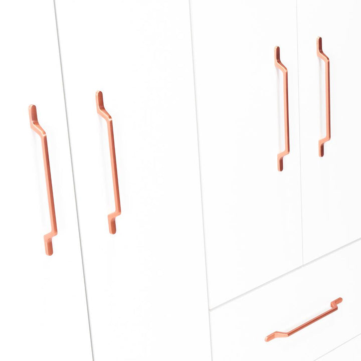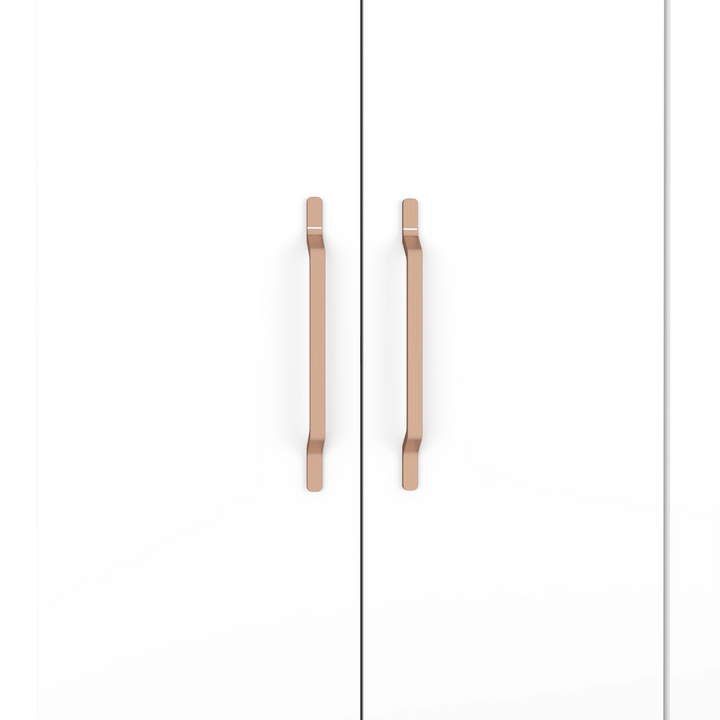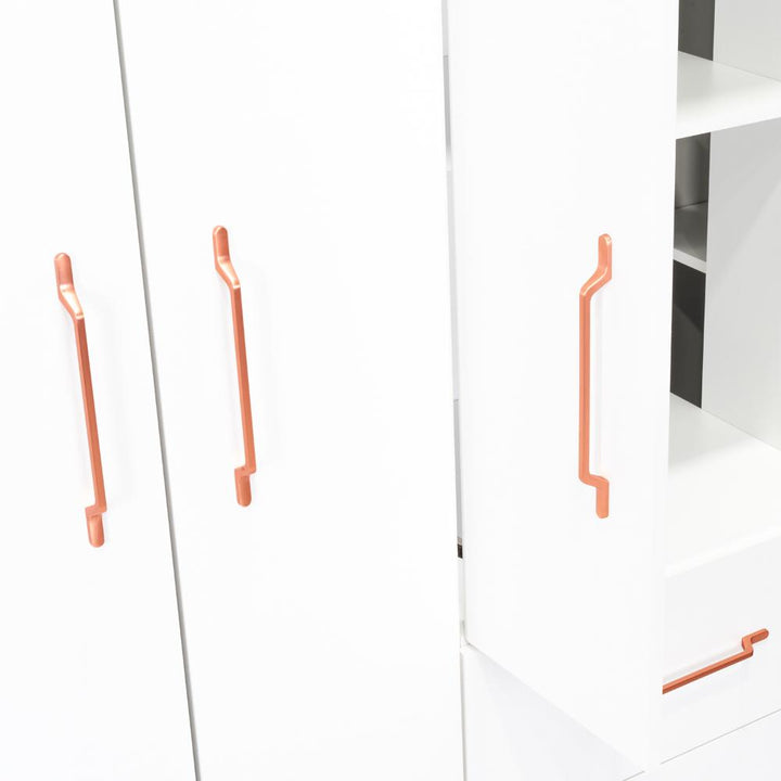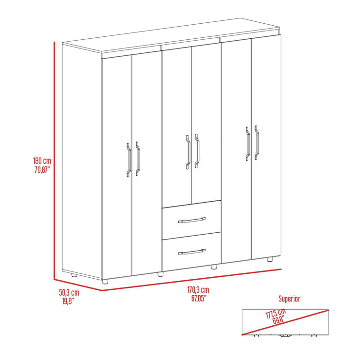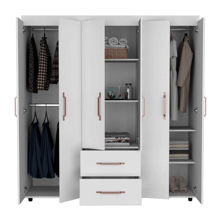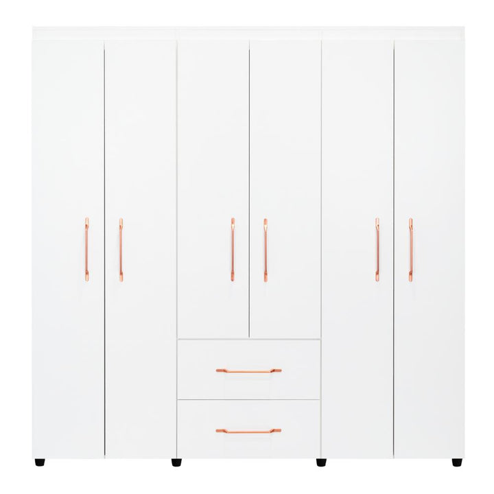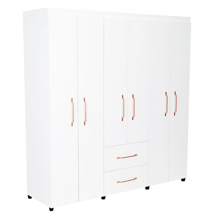 Closet, con amplios espacios y entrepaños para organizar, seis pertas abatibles, tres tubos cromados para colgar ropa, dos cajones organizadores multiusos, manijas metalicas oro rosa, deslizadores plasticos para apoyo al piso.