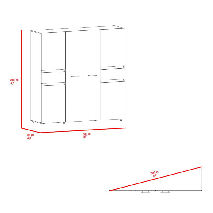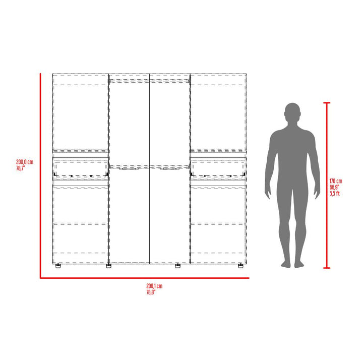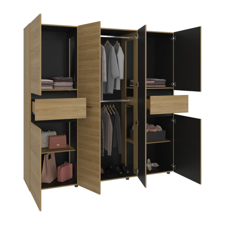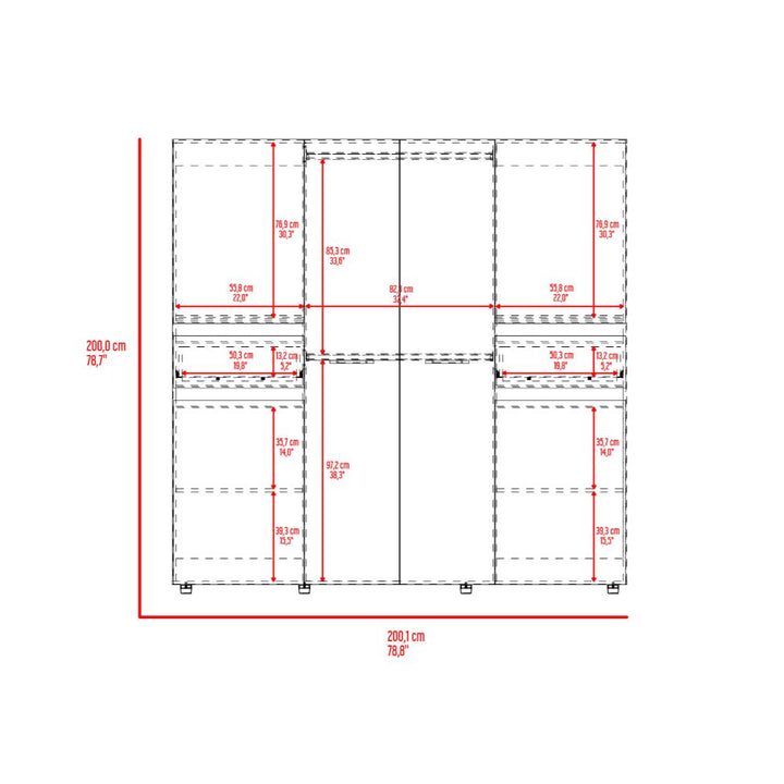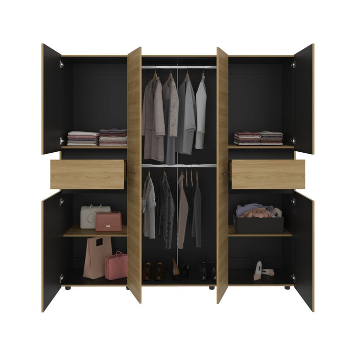 Closet, con seis puertas batientes, dos cajones, dos tubos pata colgar ropa y amplios espacios de guardado.