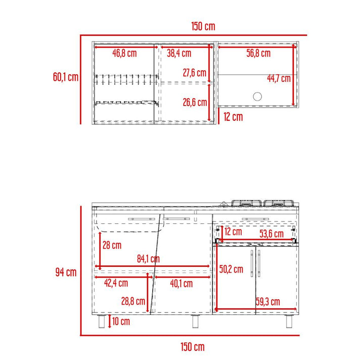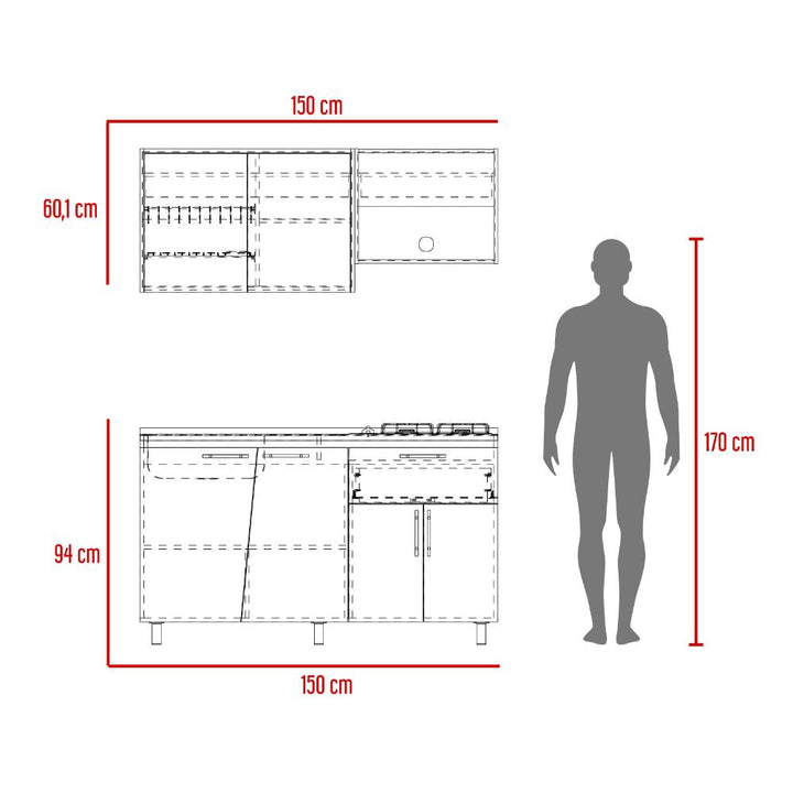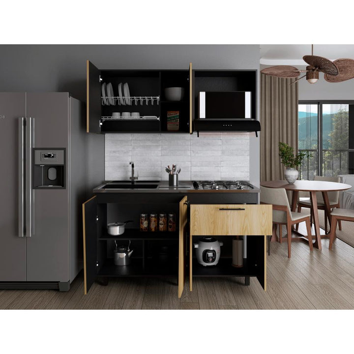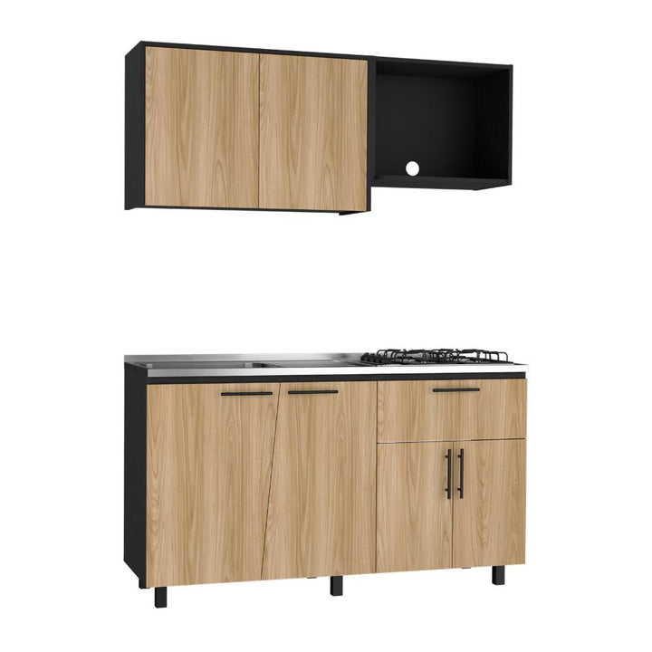 Cocina Integral, con dos puertas abatibles, incluye locero y portavasos, espacio para alimentos utensilios de cocina y decorativos, modulo independiente para campana extractora, el modulo inferior cuenta con 4 puertas abatibles, 1 cajón, patas metálicas negras, con amplio espacio para guardar alimentos, electrodomésticos u otros. *INCLUYE MESÓN*