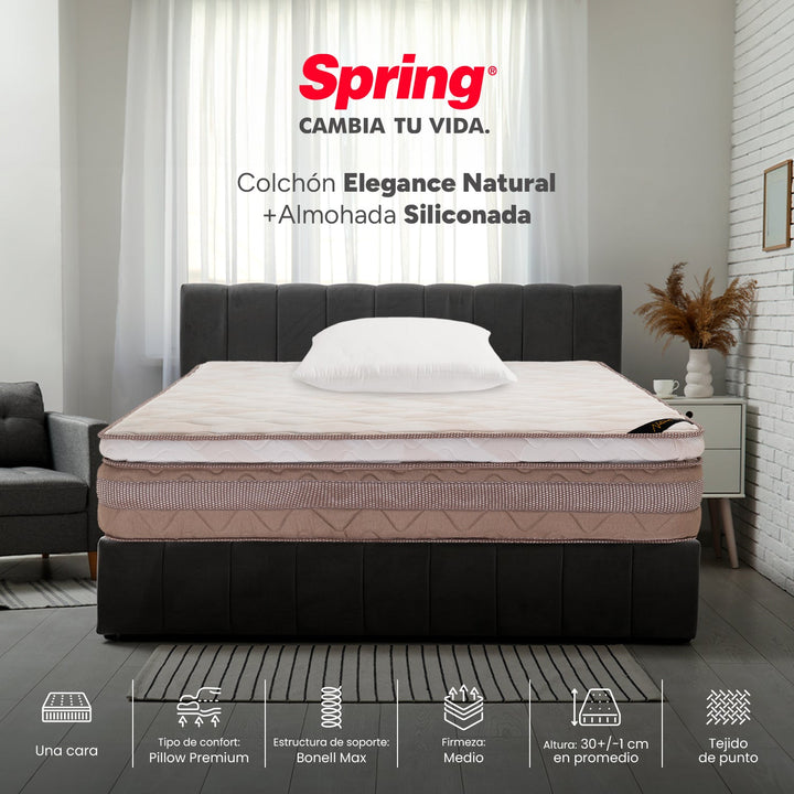 El colchón Elegance Natural de 30 cm combina tecnología, confort y compromiso con el medio ambiente. Su sistema de resortes Bonell Max, fabricados en acero con alto contenido de carbono, garantiza firmeza, soporte y durabilidad. Incorpora espuma Advance Foam, que mejora la ventilación y mantiene el colchón fresco durante la noche. Su Pillow Premium brinda suavidad y confort envolvente, ideal para un descanso profundo, natural y equilibrado con 7 años de garantía Spring.