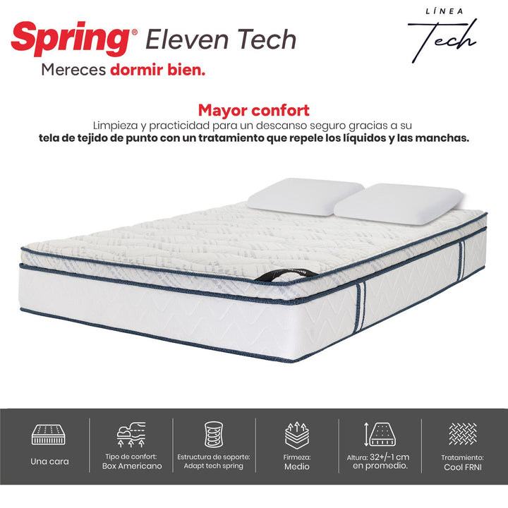 El colchón Eleven Tech de 32 cm combina tecnología y confort para un descanso de alto rendimiento. Su sistema de resortes Adapt Tech Spring se ajusta de forma independiente al cuerpo, brindando soporte personalizado y estabilidad. La tela Cool FRNI ofrece frescura constante gracias a su evacuación de humedad, mientras el Box Americano equilibra suavidad y firmeza. Diseñado con tecnología avanzada, garantiza comodidad duradera y control óptimo de temperatura.