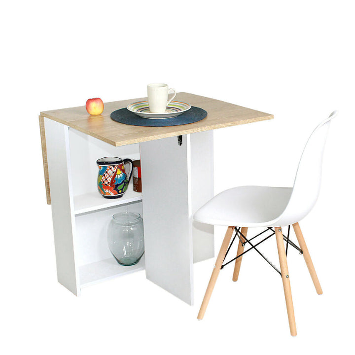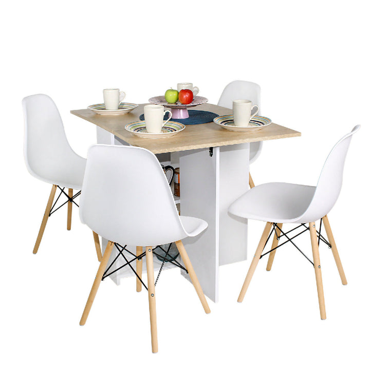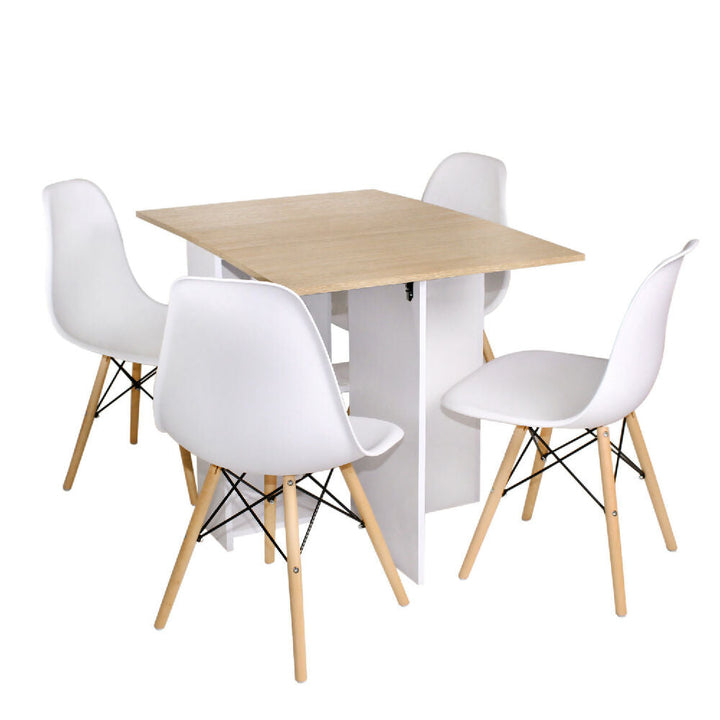 Combo Comedor ahorra espacio Plegable Amaretto en melamina 15 mm con proteccion antimicrobiana al 99,9%, practico en diferentes espacios, ½ Plegado tipo consola y espacios para guadar +Set X 4 Sillas. Asientos en polipropileno con patas de madera natural de facil ensamble.