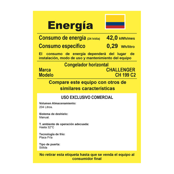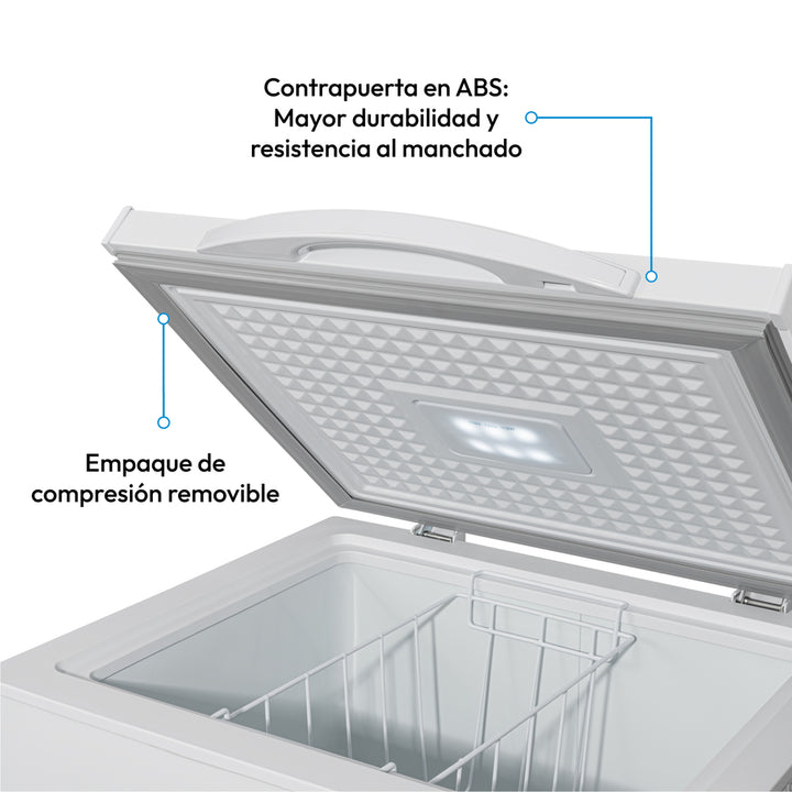 Línea : Congelador / Tipo de aparato : Chest Freezer / Volumen Bruto : 204 L / Clasificación Congelador : (- 18°C) / Clasificación Refrigerador : 5°C / Acabados : Blanco / Temperatura de trabajo : Hasta 32 °C / Tensión / Frecuencia : 115 V / 60 Hz / Potencia Nominal : 75 W / Gas refrigerante : R600a / Gas espumante : Ciclopentano / Controles : Termostato mecánico dual / Tipo de descongelación : Manual / Sistema de enfriamiento : Directo / Sistema de condensación : Skin condenser / Accesorios : Canastilla (1und) / Manijas : Externa plástica