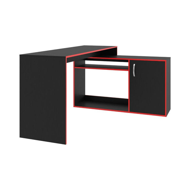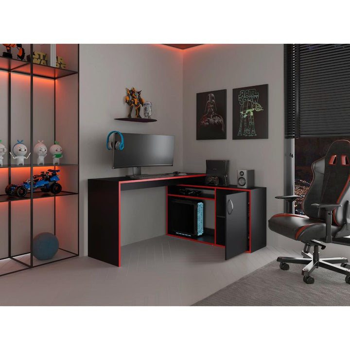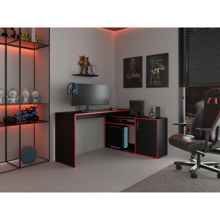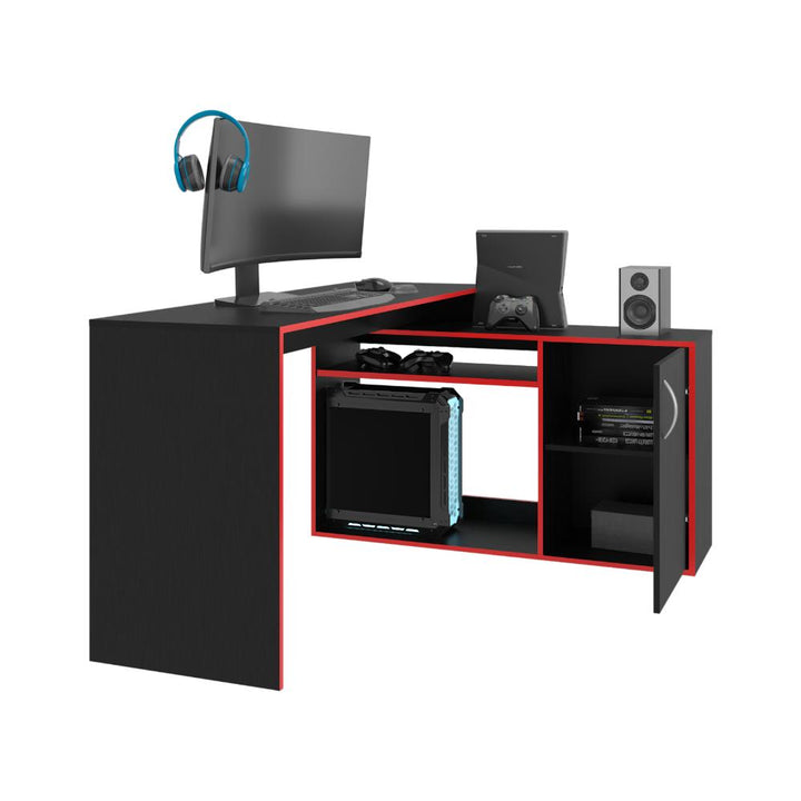 Escritorio Gamer en L, con espacio con puerta batiente para almacenar objetos y con