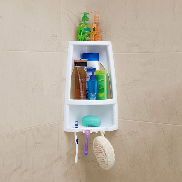 Práctico mueble esquinero ideal para optimizar el espacio en el baño y la ducha. Tiene 3 compartimentos, una jabonera con superficie antideslizantes y tres gancheras para todos los artículos necesarios. No se oxida, es resistente a la humedad. Tiene aditivo antimicrobial que previene la formación de hongos y bacterias. Resistencia hasta 6 kg de peso.
