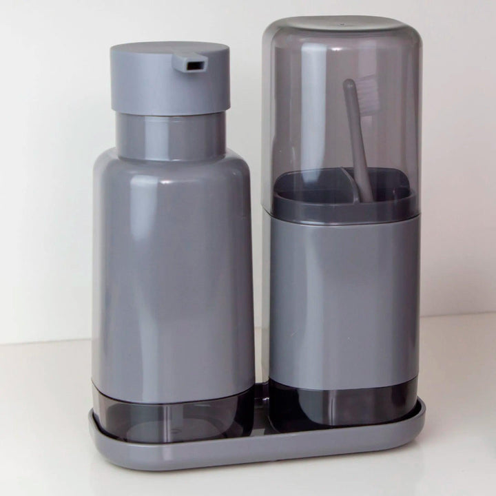Kit accesorios para baño color plomo portacepillos y jabonera liquido marca Madehome. Elaborado en material poliestireno + polipropileno para una mayor durabilidad. Perfecto para baño, sus medidas son de de ancho por de largo y de alto. Suministro un portacepillos y una jabonera liquido dual 500 ml. No incluye bandeja, accesorios ni elementos decorativos.