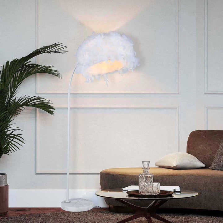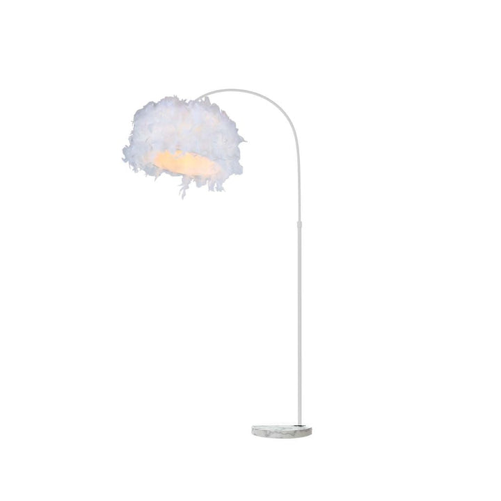 Lámpara, elaborado en Metal y Mármol, destaca por su diseño moderno, especialmente por la forma curva de su brazo, base en mármol natural y pantalla textil. Es una luminaria pensada para colocarse en espacios amplios como por ejemplo el salón-comedor o incluso en salas de espera; en color Blanco.