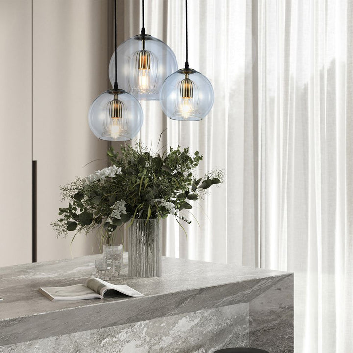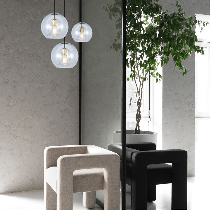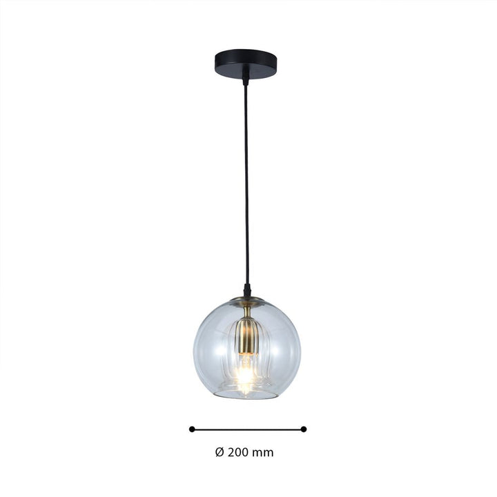 Lámpara, elaborado en Metal y Vidrio,esfera de cristal, un diseño perfecto para instalar de forma individual o agrupar lámparas en cascada disponible en tamaño small y medium, uso sugerido con bombillo de filamentos led. Este producto cuenta con certificación y cumplimiento de reglamentación Retilap.