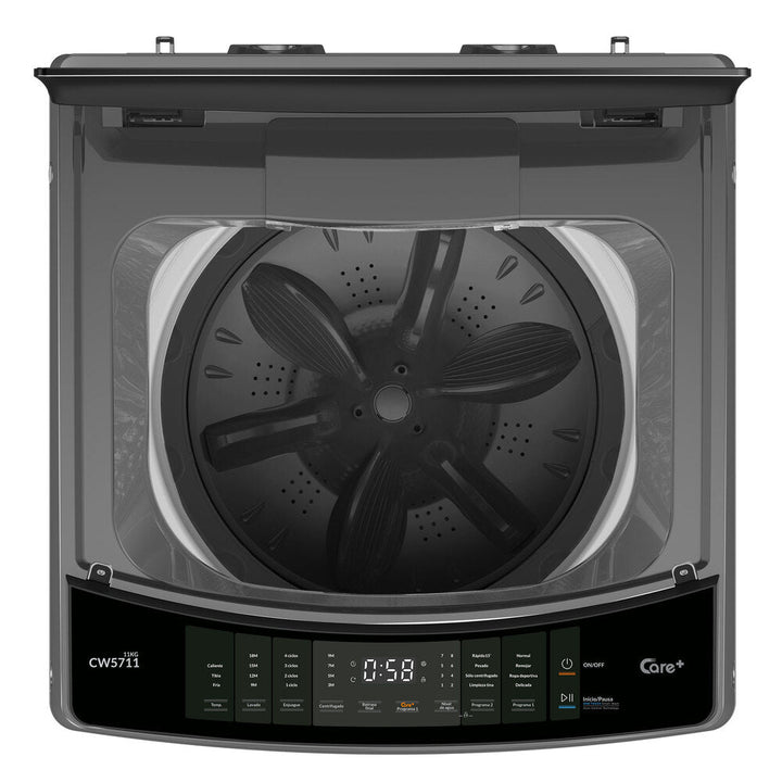 Lavadora automatica carga superior de 11 Kg ( 24 Lbs ) Cw 5711 Dg / Sistema anti enredo mejor limpieza, menos bobinado. / Elige la función Care+ para reducir los enredos en la ropa que se producen durante el proceso de lavado. / Menos tiempo, mayor rotación, mejor rendimiento de lavado. / (One touch) un sistema de lavado inteligente, enciende e inicia el lavado, la función Fuzzy logic se activa para medir el peso de la ropa y el nivel de agua correspondiente ; Una vez que se active la función inteligente One touch, se configura un programa adecuado y se inicia el proceso de lavado.