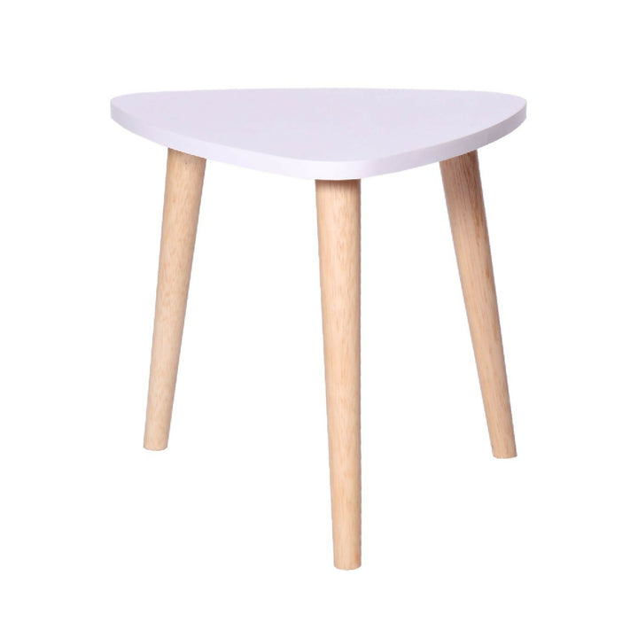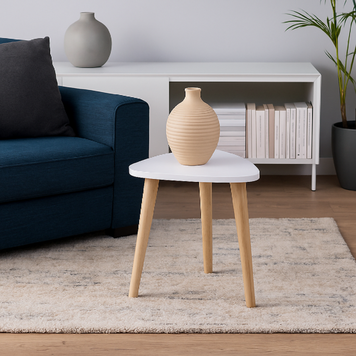 Mesa Auxiliar Triangular Blanca. fabricada en melamina con protección antimicrobiana al 99.9% y patas torneadas en madera.