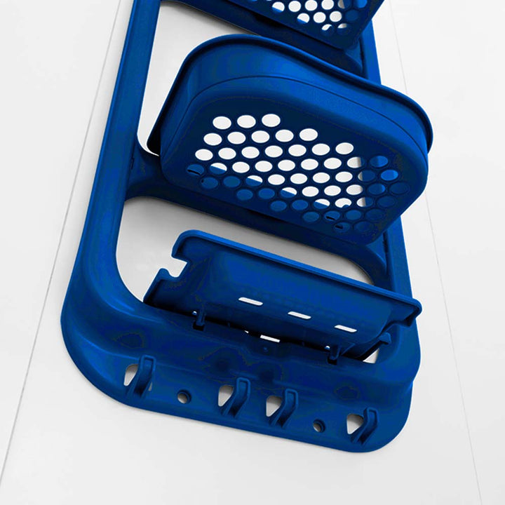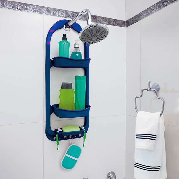 Tres entrepaños con el tamaño ideal de los envases. Bandejas mas profundas y con mayor altura y perforaciones que permiten filtrar el agua y facilitan la limpieza. Adaptador que facilita instalar en cualquier tamaño de grifo ; pared o ducha; se puede retirar o dejar a la preferencia. Jabonera con drenaje y espacio para rasuradora. 4 ganchos para colgar accesorios de ducha.