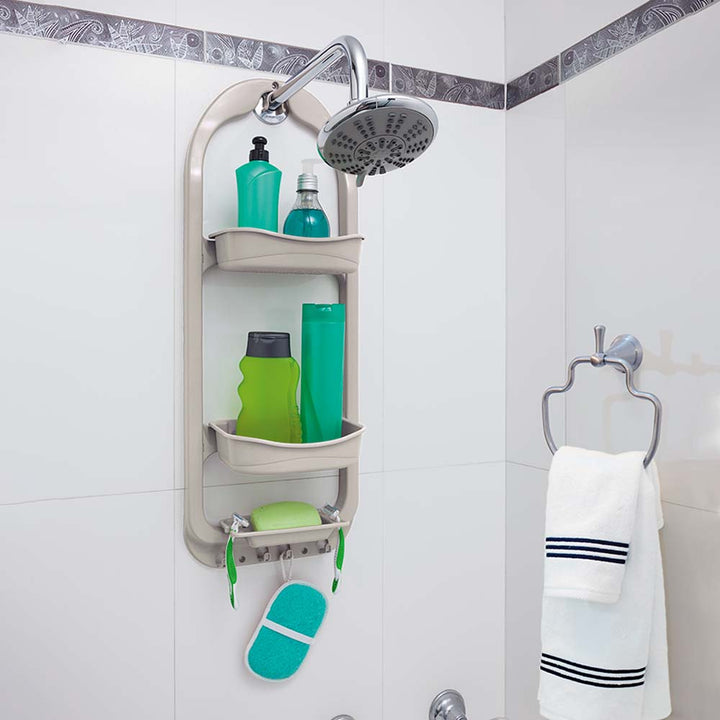 Tres entrepaños con el tamaño ideal de los envases. Bandejas mas profundas y con mayor altura y perforaciones que permiten filtrar el agua y facilitan la limpieza. Adaptador que facilita instalar en cualquier tamaño de grifo ; pared o ducha; se puede retirar o dejar a la preferencia. Jabonera con drenaje y espacio para rasuradora. 4 ganchos para colgar accesorios de ducha.
