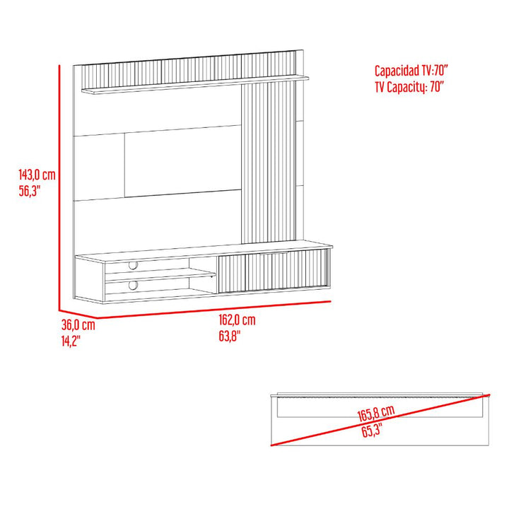 Panel de TV, con diseño moderno, múltiples entrepaños para ubicar objetos. Espacio de para tv 55 a 70".