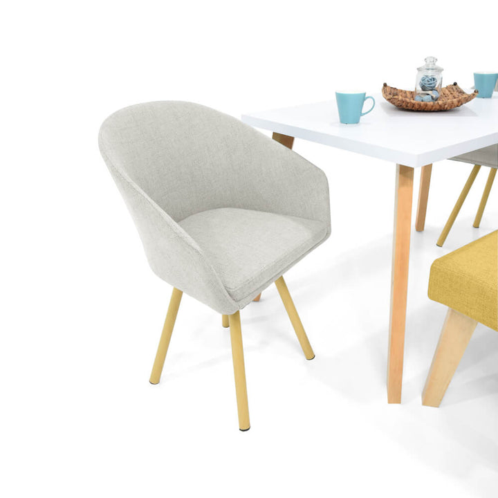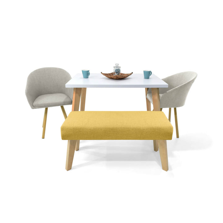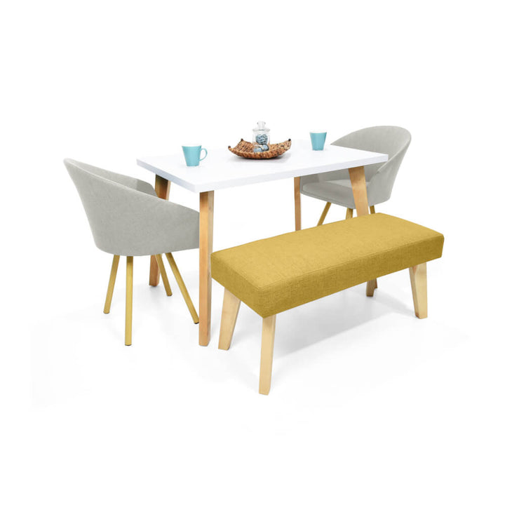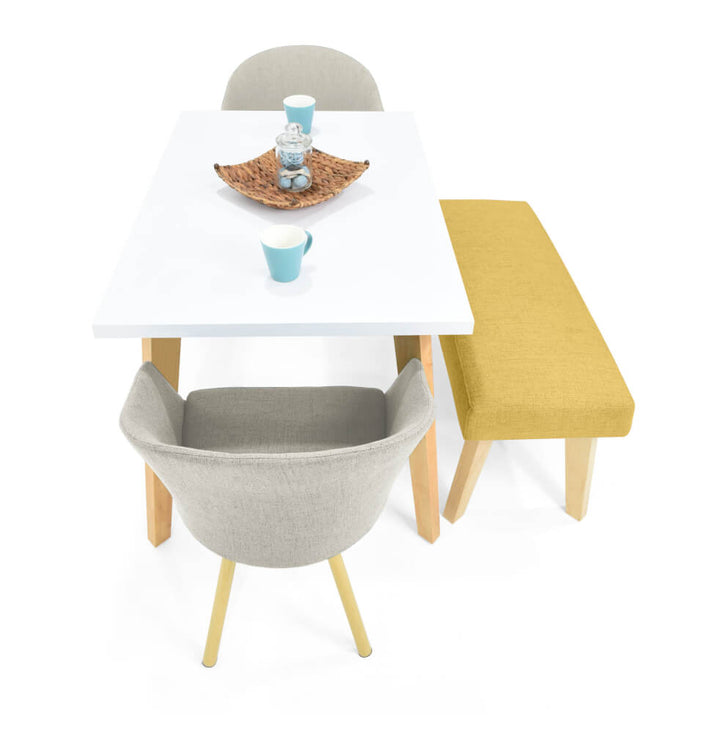 Set de comedor 4 Puestos Lugo Matiz con Sillas Tokyo Taupe y Butaco Mostaza