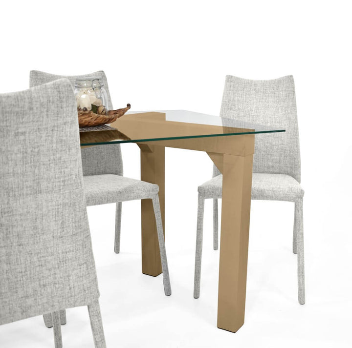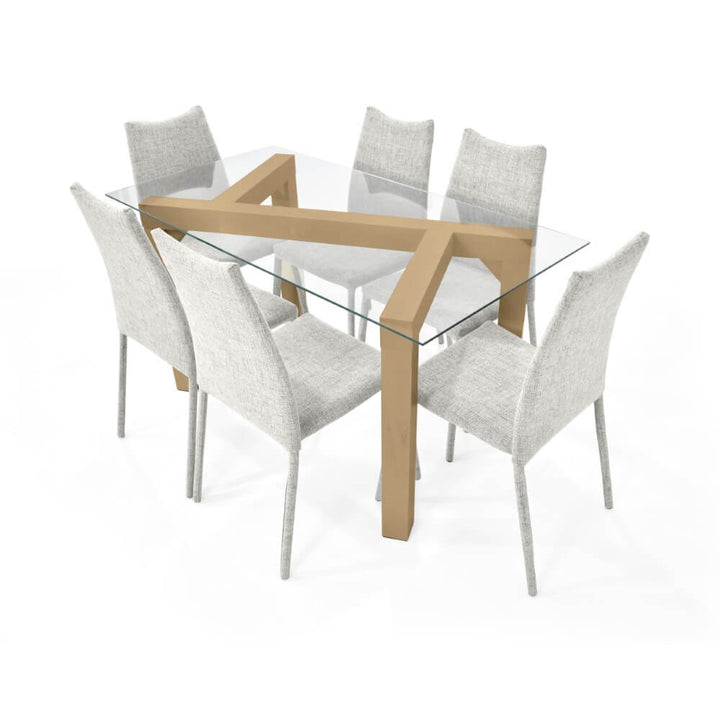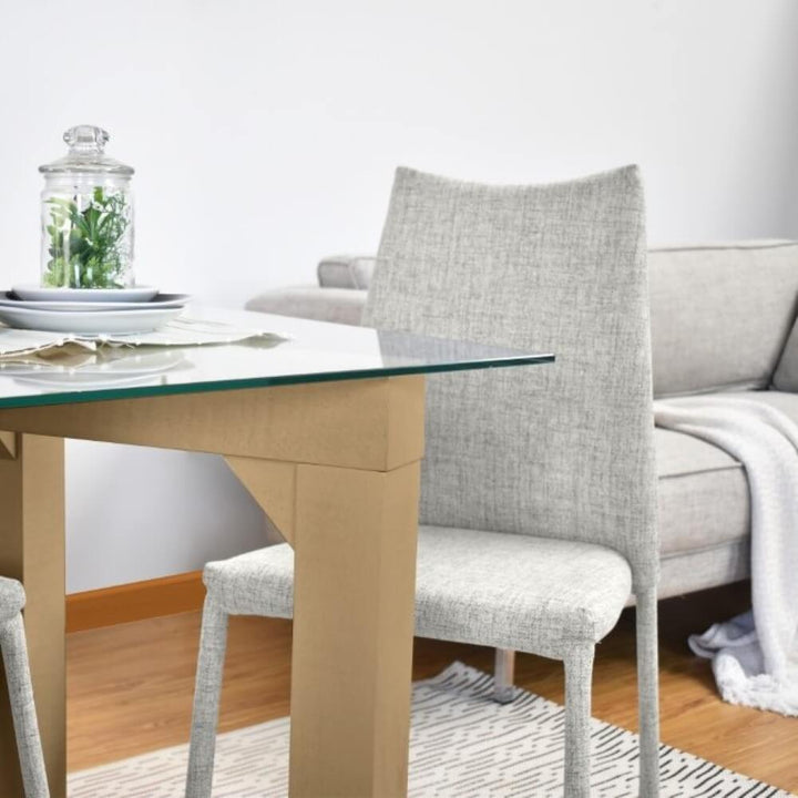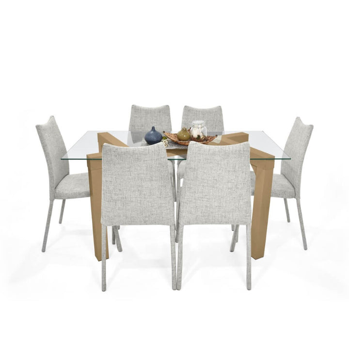 Comedor Beirut 6 puestos mesa de corte contemporáneo que evoca modernidad y sobriedad , ideal para espacios actuales donde se busque modernidad y un toque de diferenciación dada su forma y acabados, está fabricado con una tapa en vidrio templado de 8 mm, la base con una fuerte estructura en mdf y madera de pino entamborada, acabado en laca fibrada color cenizo. Silla Palermo es una silla de comedor, visualmente elegante con acabados refinados, con curvas que generan un atractivo en cualquier estancia de la casa. Estructura tapizada con espuma de alta densidad y forros en tela poliéster colores Plata y Petróleo.