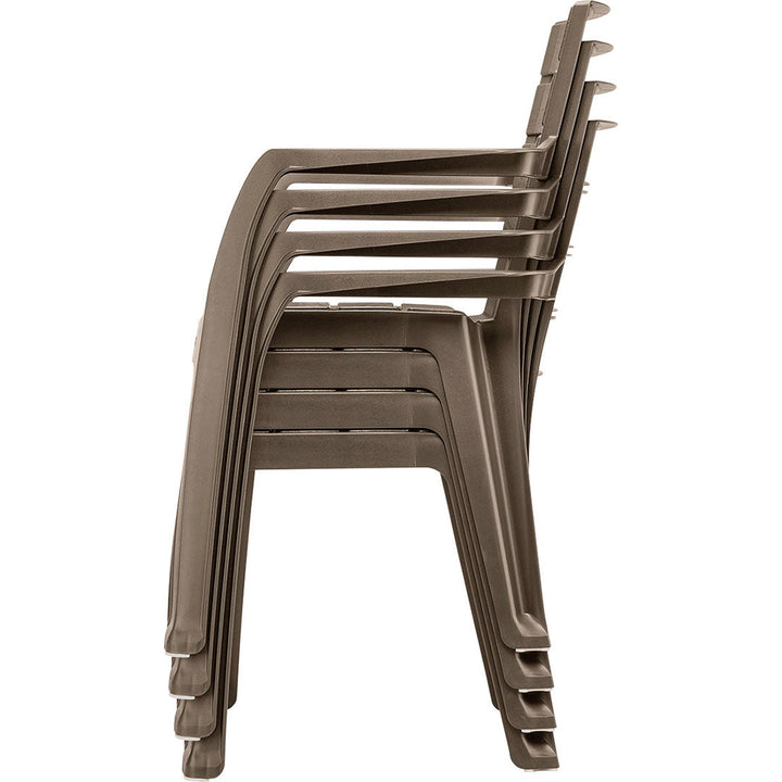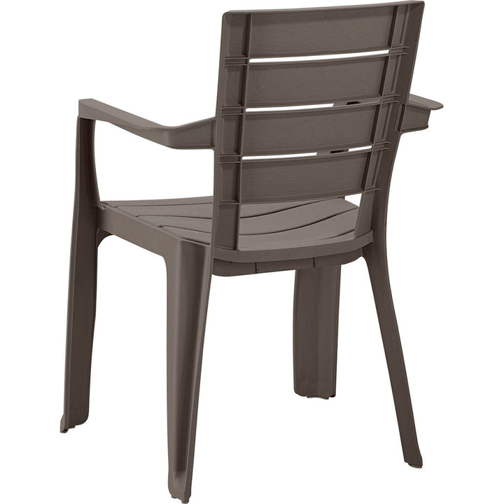 Textura apariencia madera, resistencia 114 kilos La Silla Barú de apariencia madera es simple y elegante, inspirada en una textura natural que transmite tranquilidad, relajación y armonía, lo que la hace que sea el complemente ideal para el espacio de tu casa, finca u oficina. La silla Barú con brazos está fabricada en resina, un material resistente al agua y que permite una mayor duración del producto, además soporta un peso máximo de hasta 115 kg.