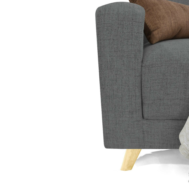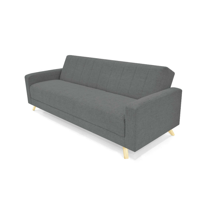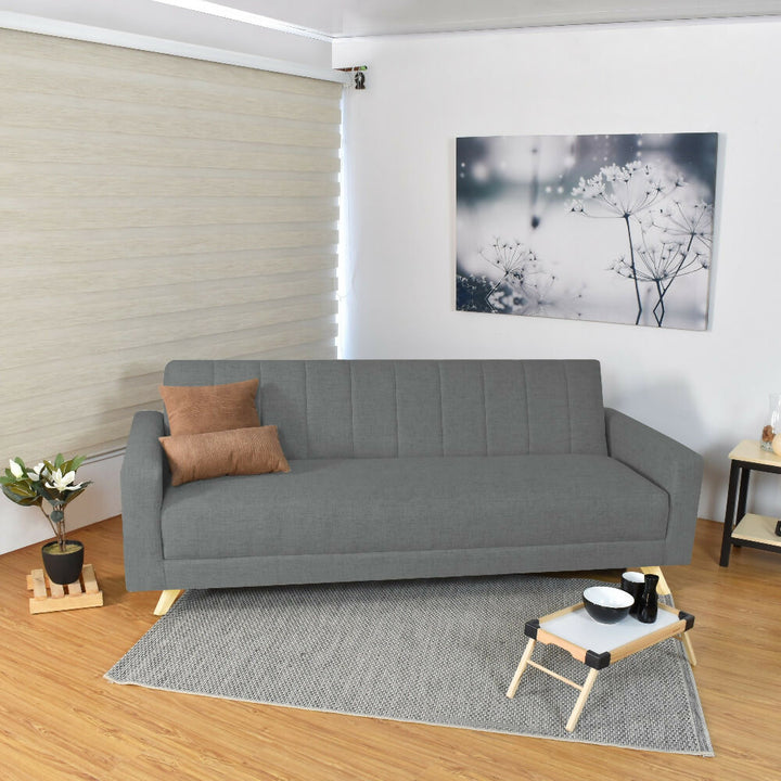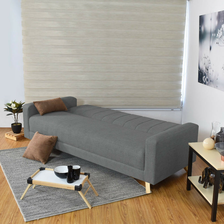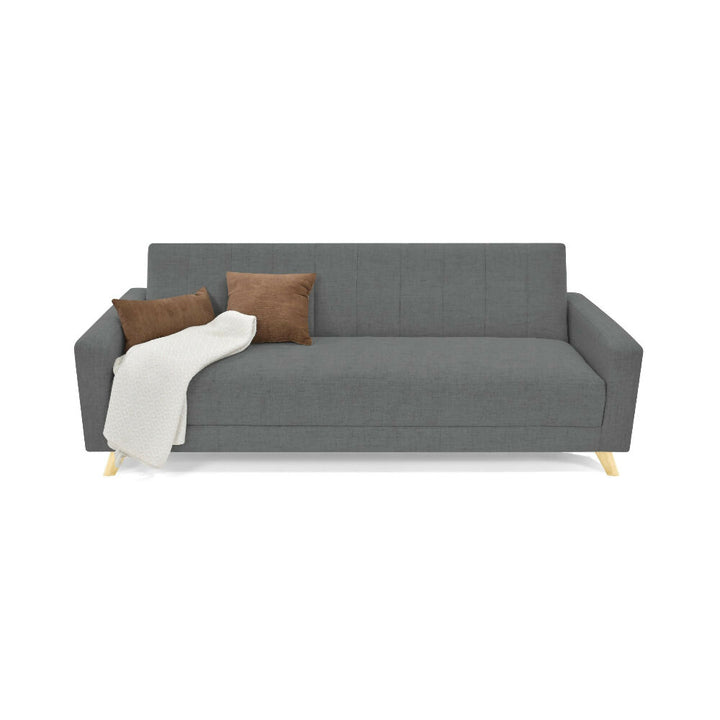 El Sofá cama Dominic está elaborado en una fuerte estructura de madera de pino inmunizada naturalmente, relleno con espuma de alta densidad y tapizado con tela poliéster de excelente calidad. Patas en madera pino.