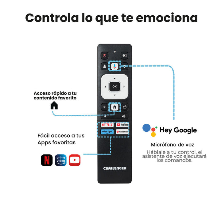 Con el Televisor Google TV de Challenger, el entretenimiento está al alcance de tu mano. Gracias al sistema operativo Google TV integrado, tendrás acceso a una amplia variedad de aplicaciones de entretenimiento, desde las más populares hasta las más especializadas, (YouTube, Netflix, Disney, Prime Video, Mas, HBO).
