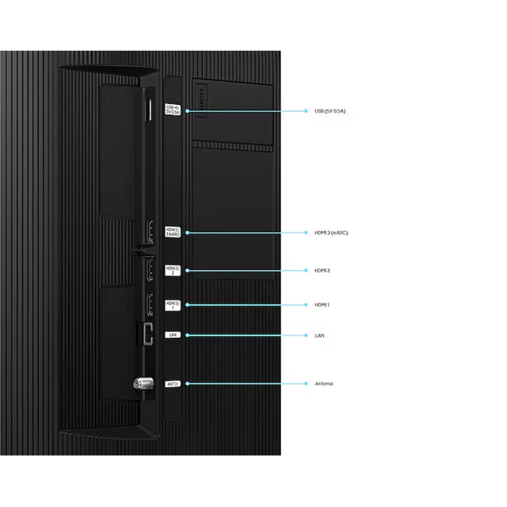 Smart TV, si es Smart TV asistente de voz no soporta asistente de voz sistema operativo tizen sintonizador digital DVB T2 Si tiene sintonizador digital DVB-T2 tiene tecnología para compartir pantalla no tiene opción de compartir pantalla potencia de audio 20 Watts velocidad de Respuesta del TV 60 Hz