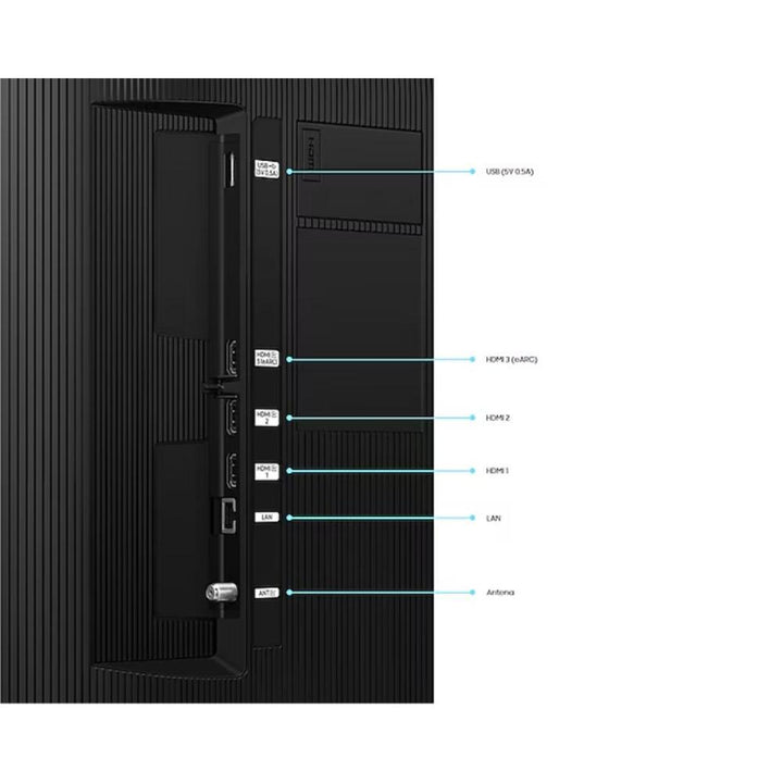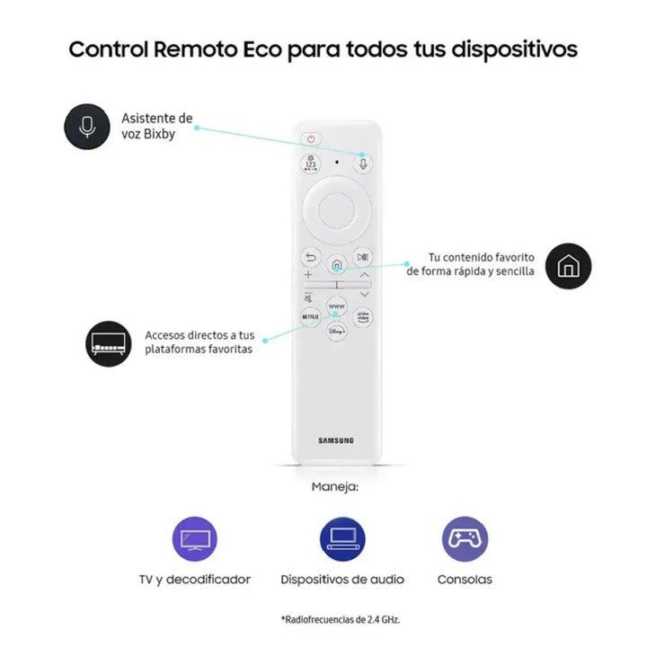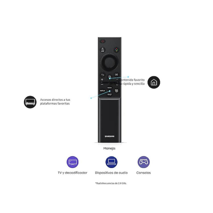 Smart tv, si es Smart TV asistente de voz no soporta asistente de voz sistema operativo tizen sintonizador digital DVB T2 si tiene sintonizador digital DVB-T2, tiene tecnología para compartir pantalla si tiene opción de compartir pantalla potencia de audio 40 Watts velocidad de respuesta del TV 120 Hz.