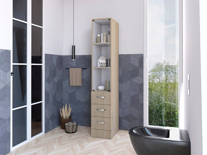 Organizador de Baño, con 4 cajones deslizables y variedad de entrepaños para ubicar objetos de aseo.